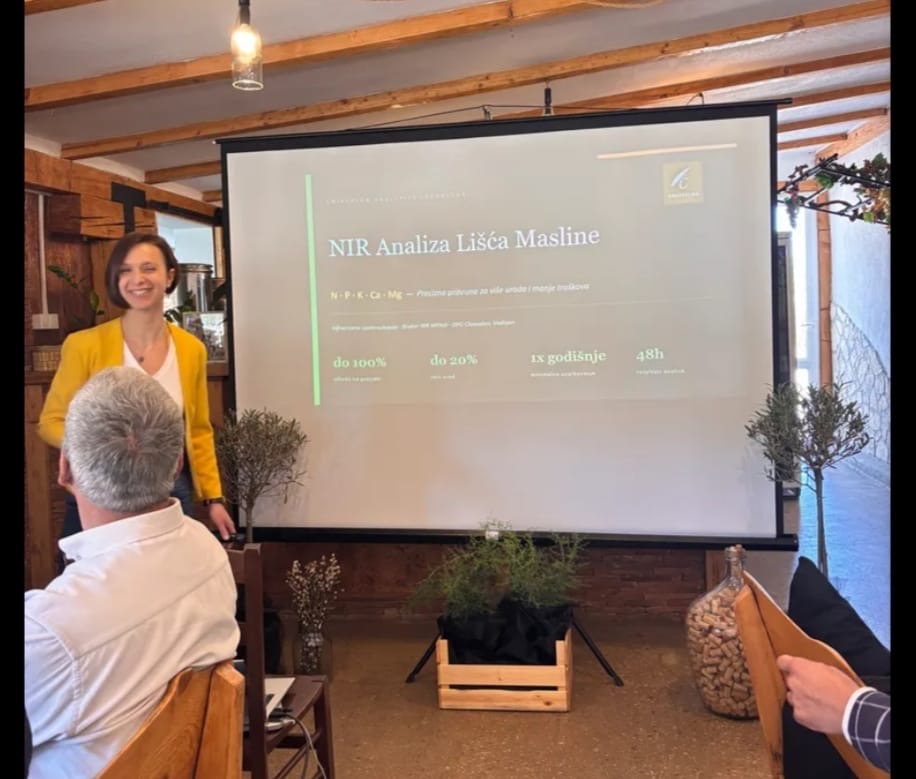 Jedna od središnjih tema bila je NIR analiza lišća masline, koju već godinu dana provodi OPG Chiavalon. Dr. Tihana Vujinović na jednostavan i razumljiv način predstavila je proces analize, kao i njezine troškove i prednosti za proizvođače.